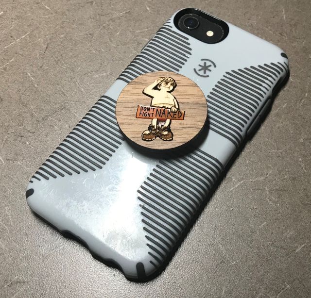 Now we fast forward to the year 2019 and Ken has a laser. He has to cut something on it to show what it can and can’t do…PFC Knucklehead to the rescue! This is the round about way he ended up on the back of my phone.